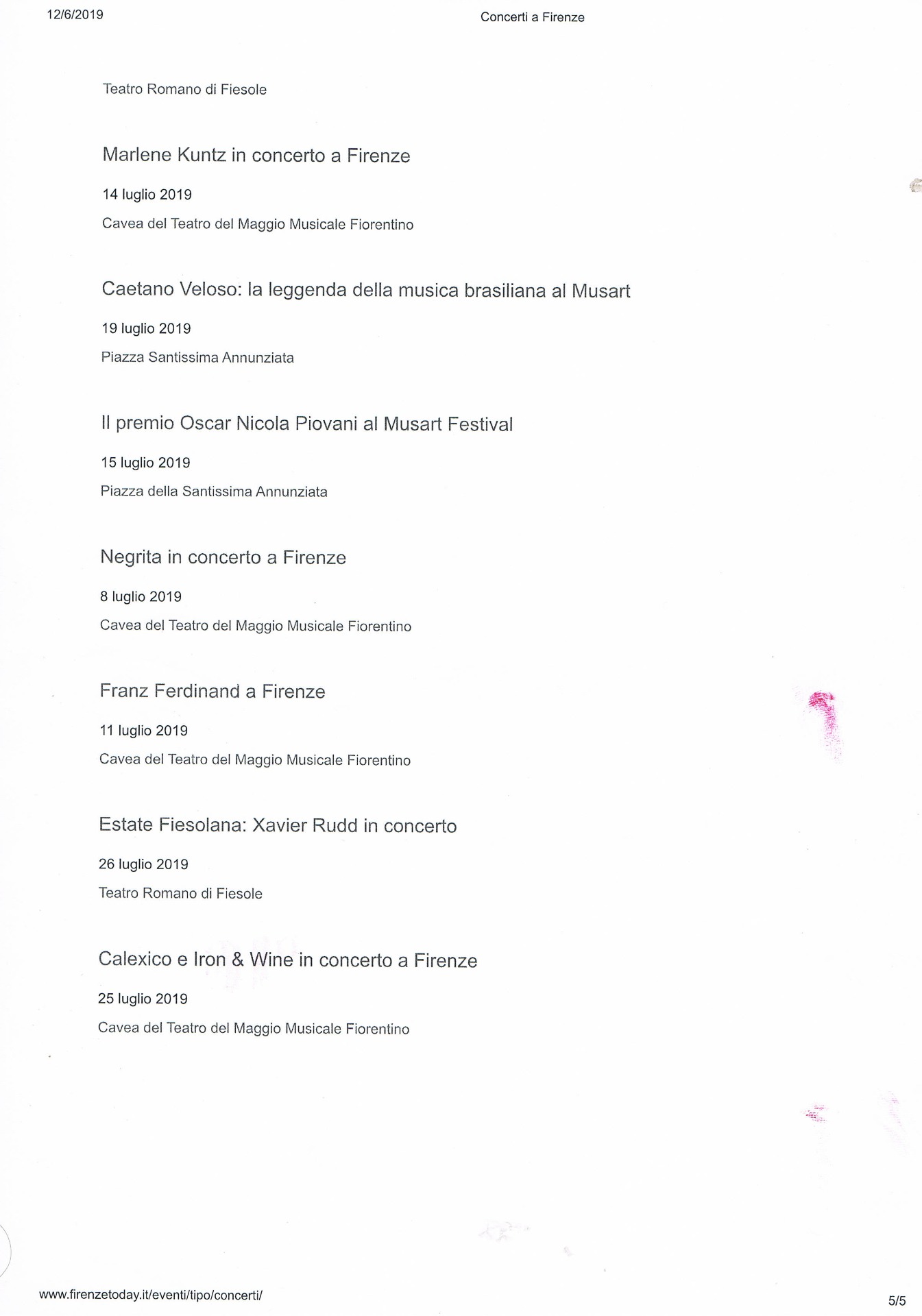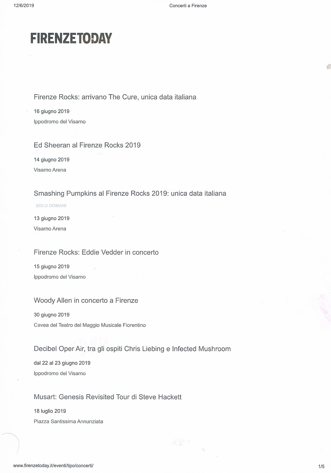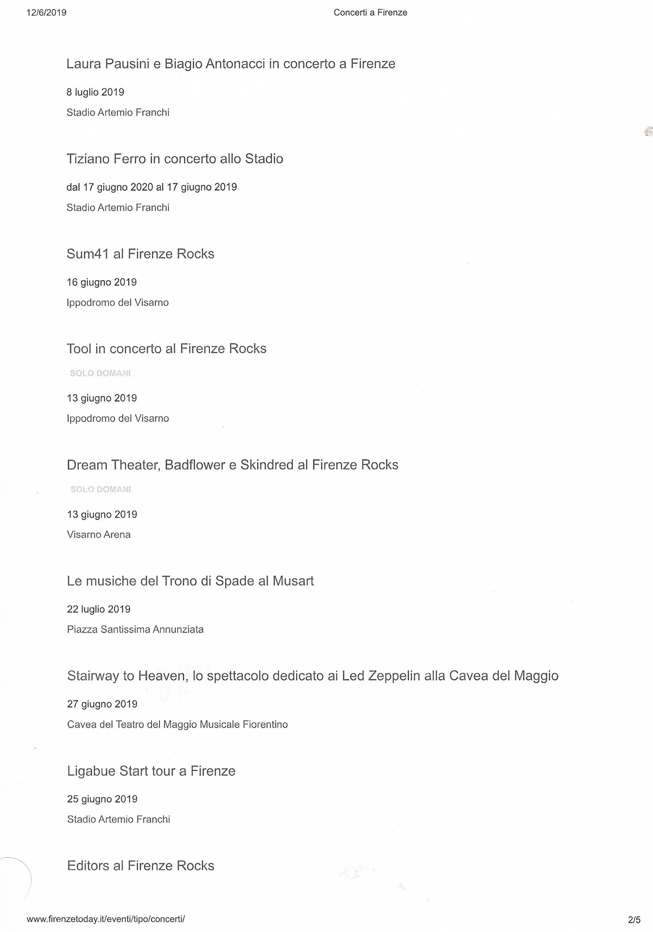 CONCERTI FIRENZE CALENDARIO BOXOFFICE 2019