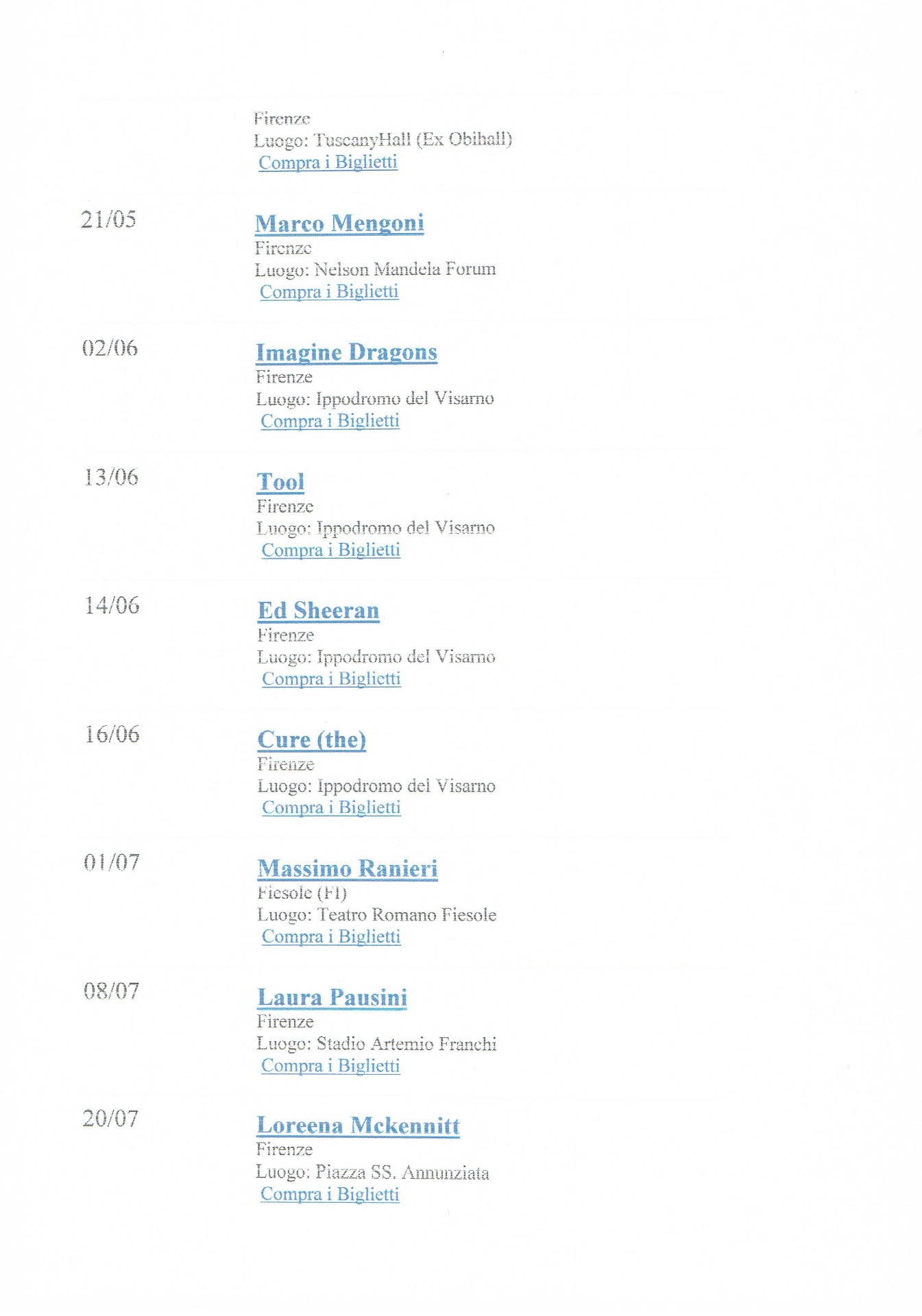 CONCERTI FIRENZE CALENDARIO 2019 DA OTTOBRE 2019 A LUGLIO 2020
